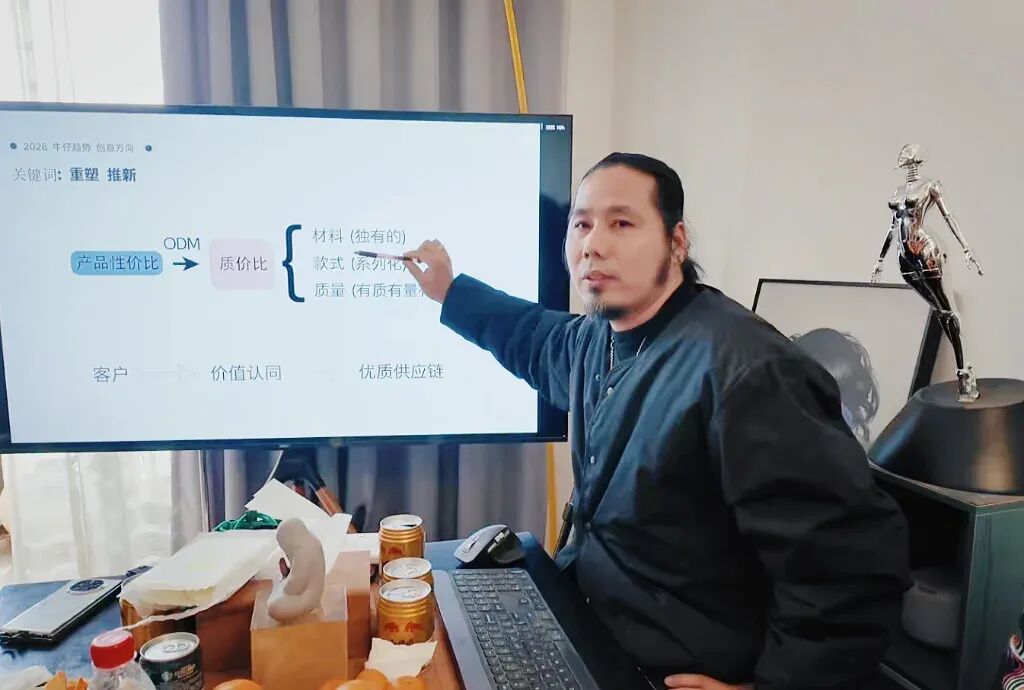 他是牛仔原创设计领域公认的“牛人”。在分享中,他从自身经历出发,讲述了自己如何从设计出发,深入到牛仔面料研发、亲自下手洗水创作,将手工的温度加入设计当中。