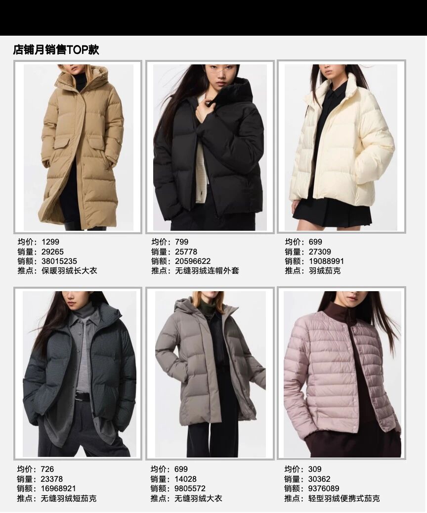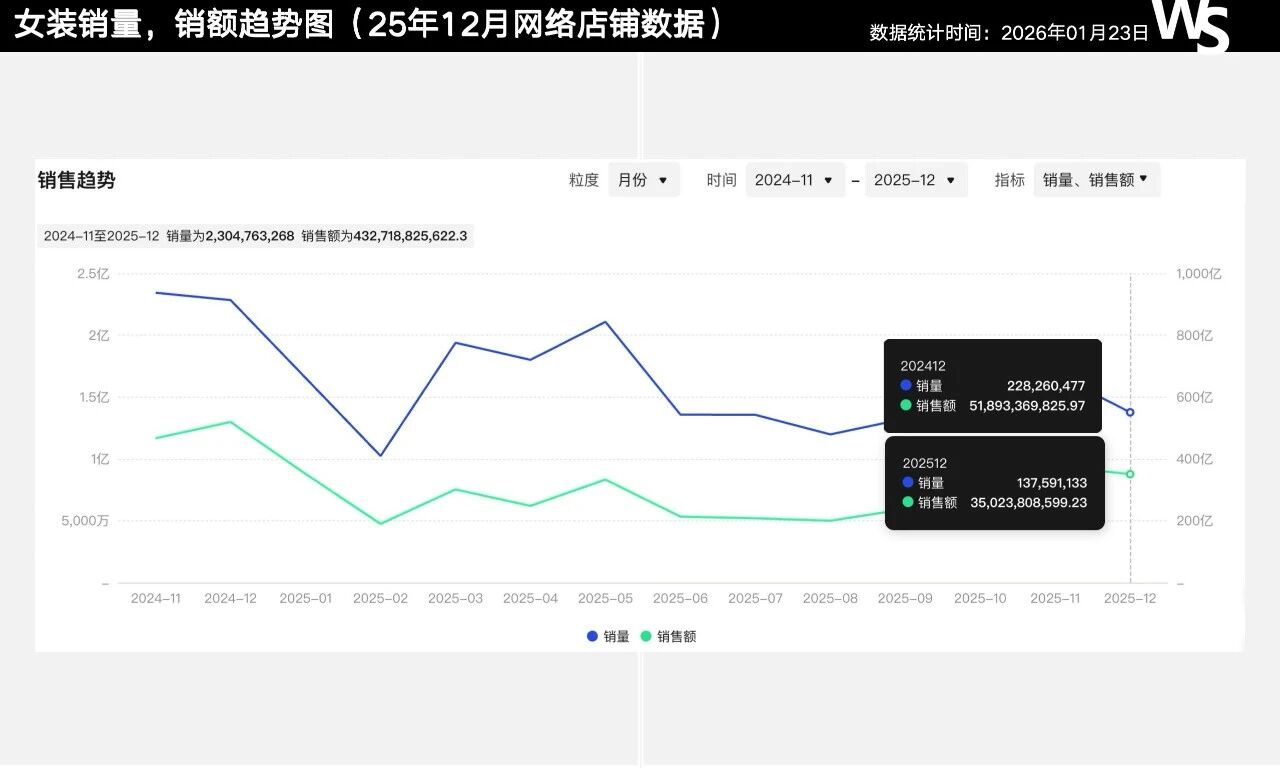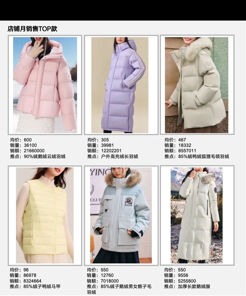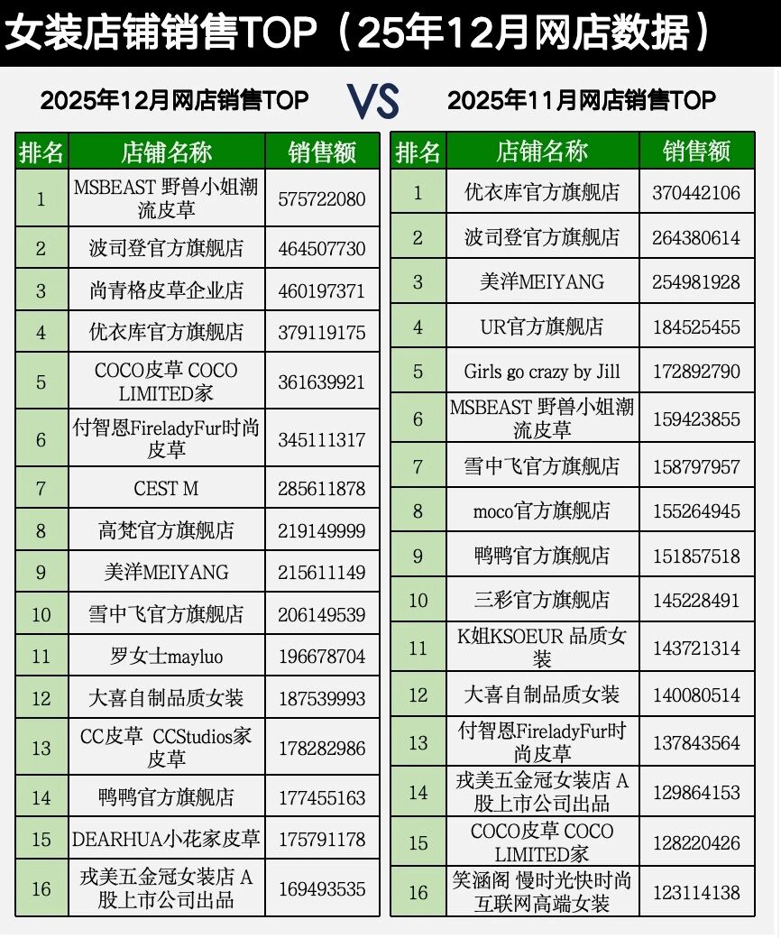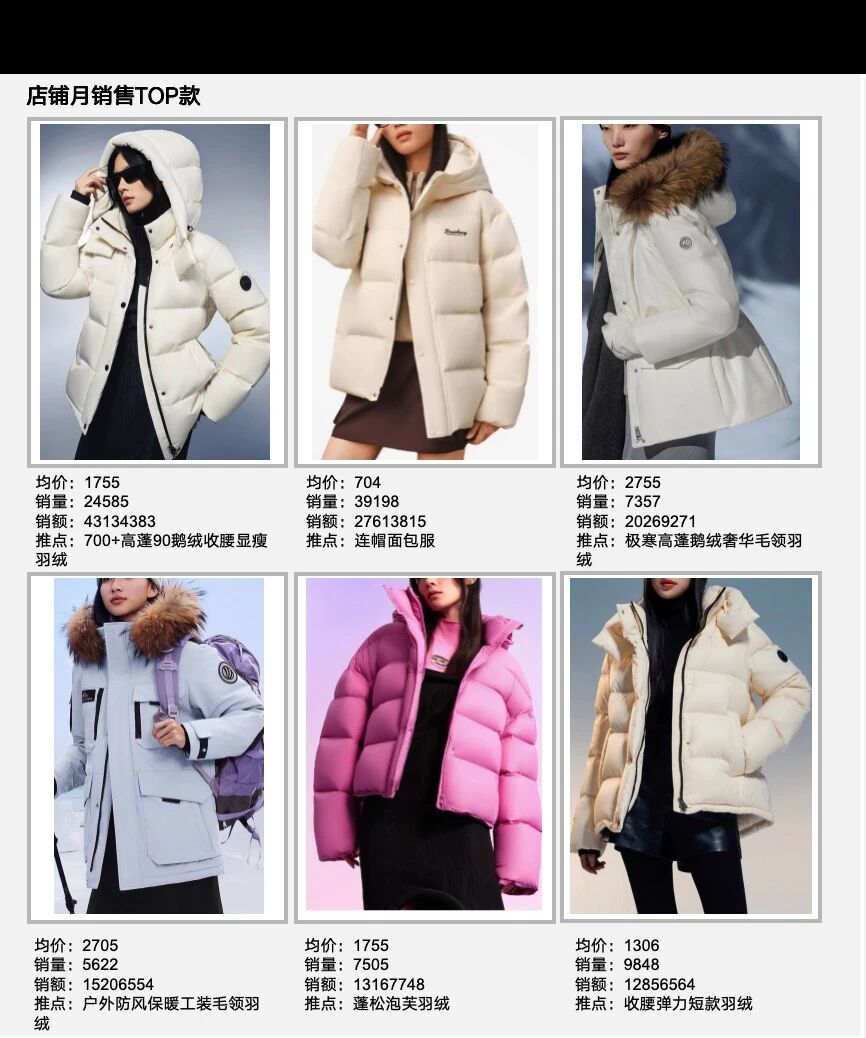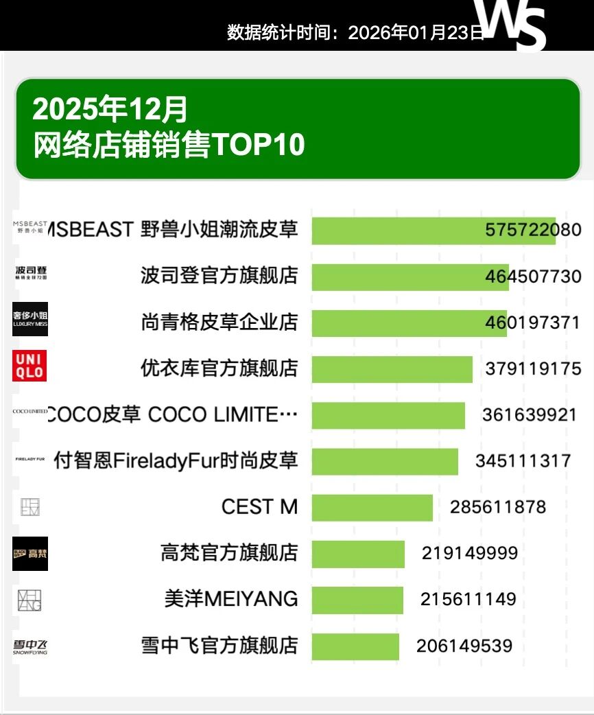 2025年12月女装线上销售额达350亿元,销量1.38亿件,同比2024年12月降幅显著(销售额-32.6%、销量-39.7%)。整体市场延续寒潮效应,羽绒品类持续领跑,皮草类大幅增长。MSBEAST野兽小姐以高端皮草产品强势登顶,单月销售额达5.7亿元,主打奢感、高价位人造毛。波司登稳居第二,突出专业羽绒科技与明星代言。优衣库以轻量羽绒打稳基础盘,销量稳定。COCO皮草、尚青格等也凭借短款、廓形、仿皮草材质迅速拉升热度。整体热销关键词集中于“保暖、蓬松感、轻奢、高性价比”,12月呈现风格多元与材质丰富趋势——顽石频道大数据趋势分析